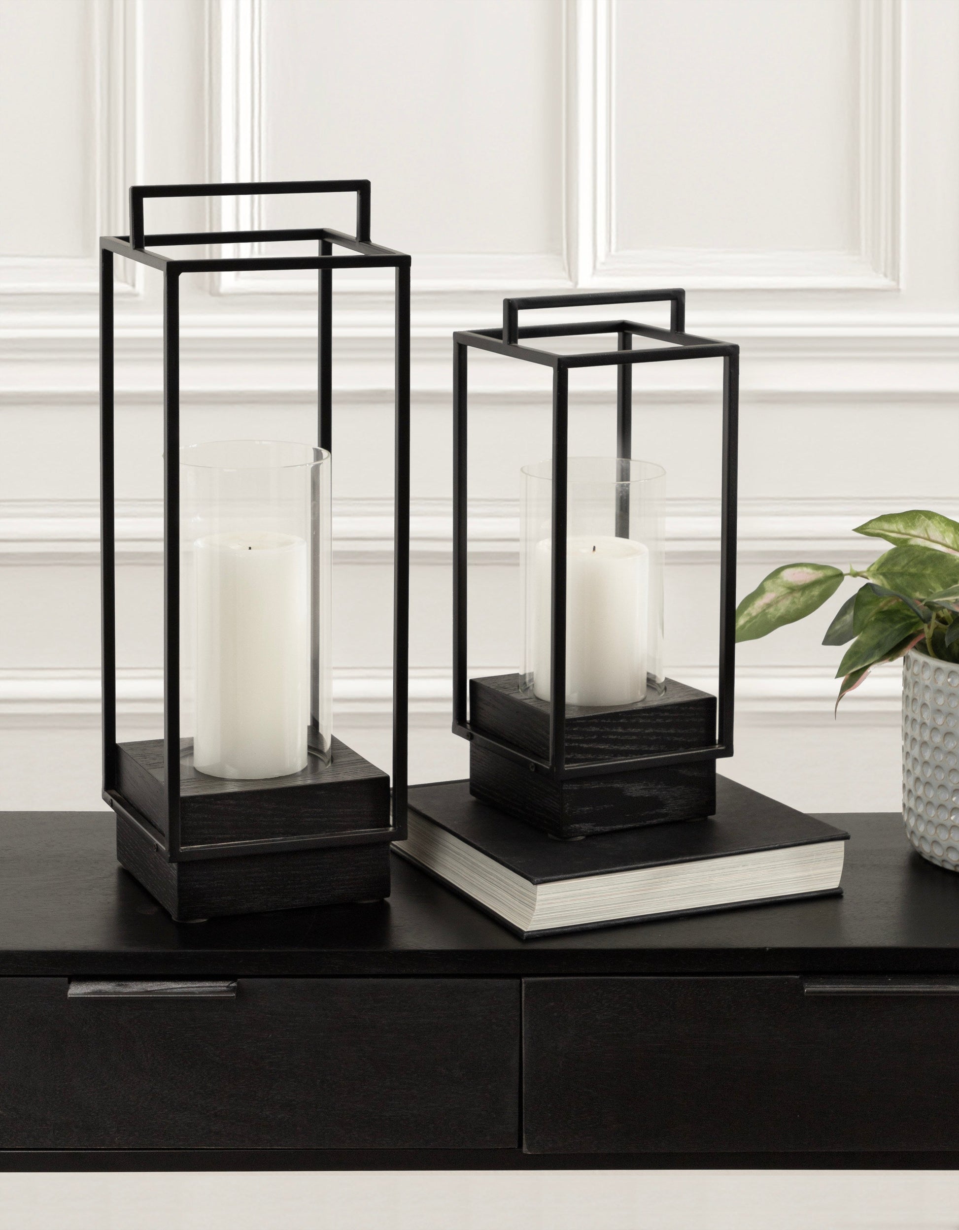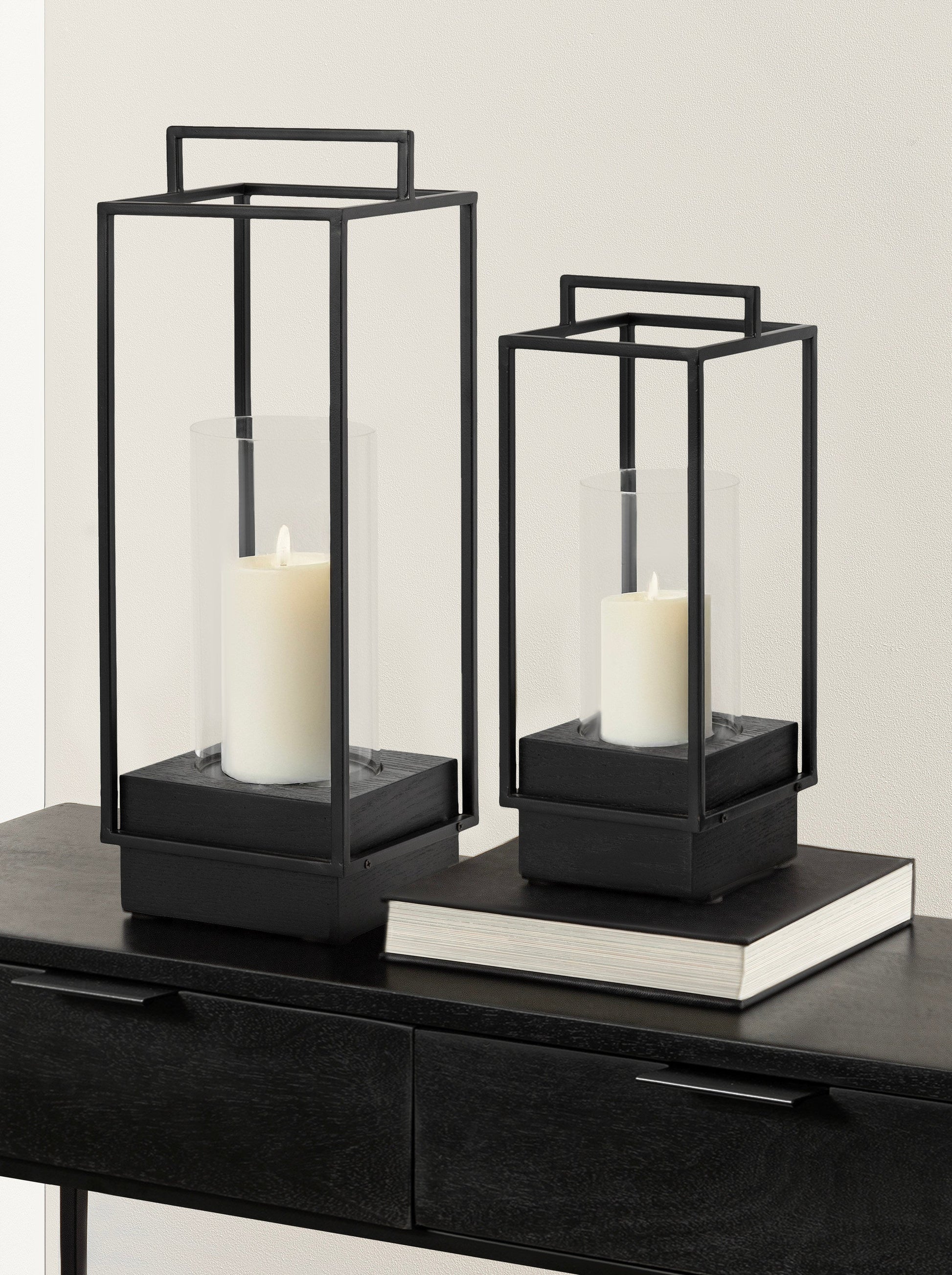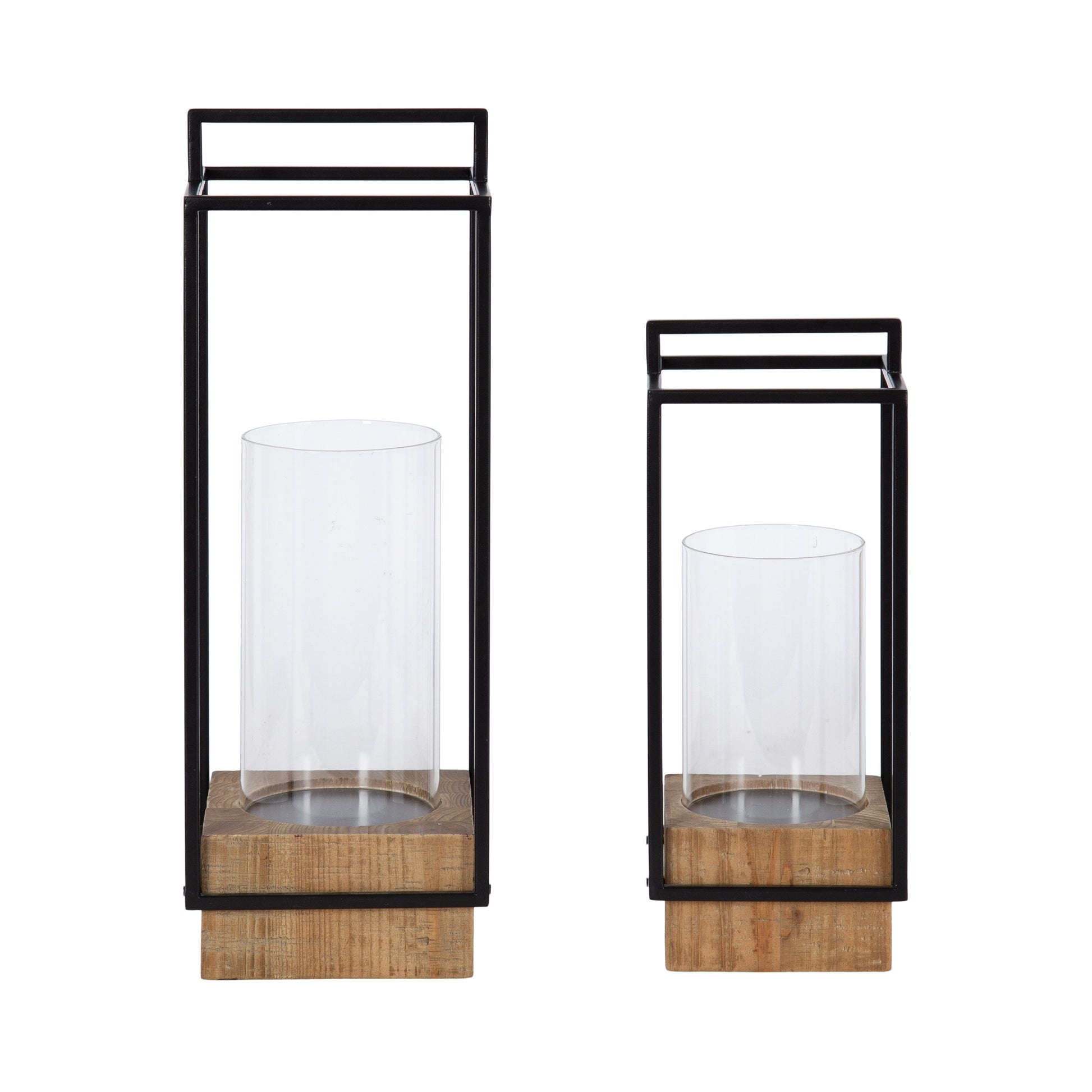 Upscale your hearth room with this charming two-piece candle holder set. This set features two stunning candle holders designed to enhance any space with their lantern-inspired construction. The sturdy wooden bases provide durability, while the sleek metal framing and handles add a sturdy yet decorative touch. These candle holders have a lantern design with attractive handles to create a stylish way to showcase your favorite candles. Each candle holder comes with a glass cylinder built to hold flameless candles up to 3 inches in diameter. The spacious glass cylinders allow the warm candlelight to glow beautifully, creating a cozy ambiance in any room.