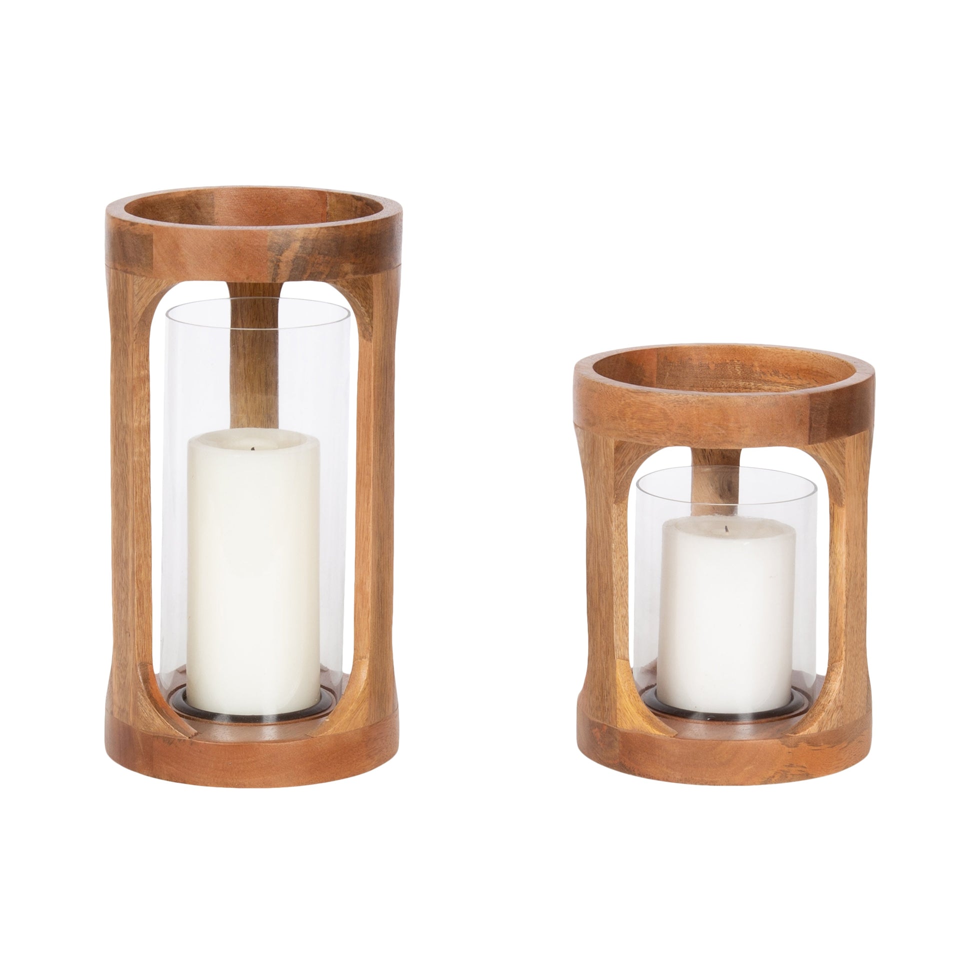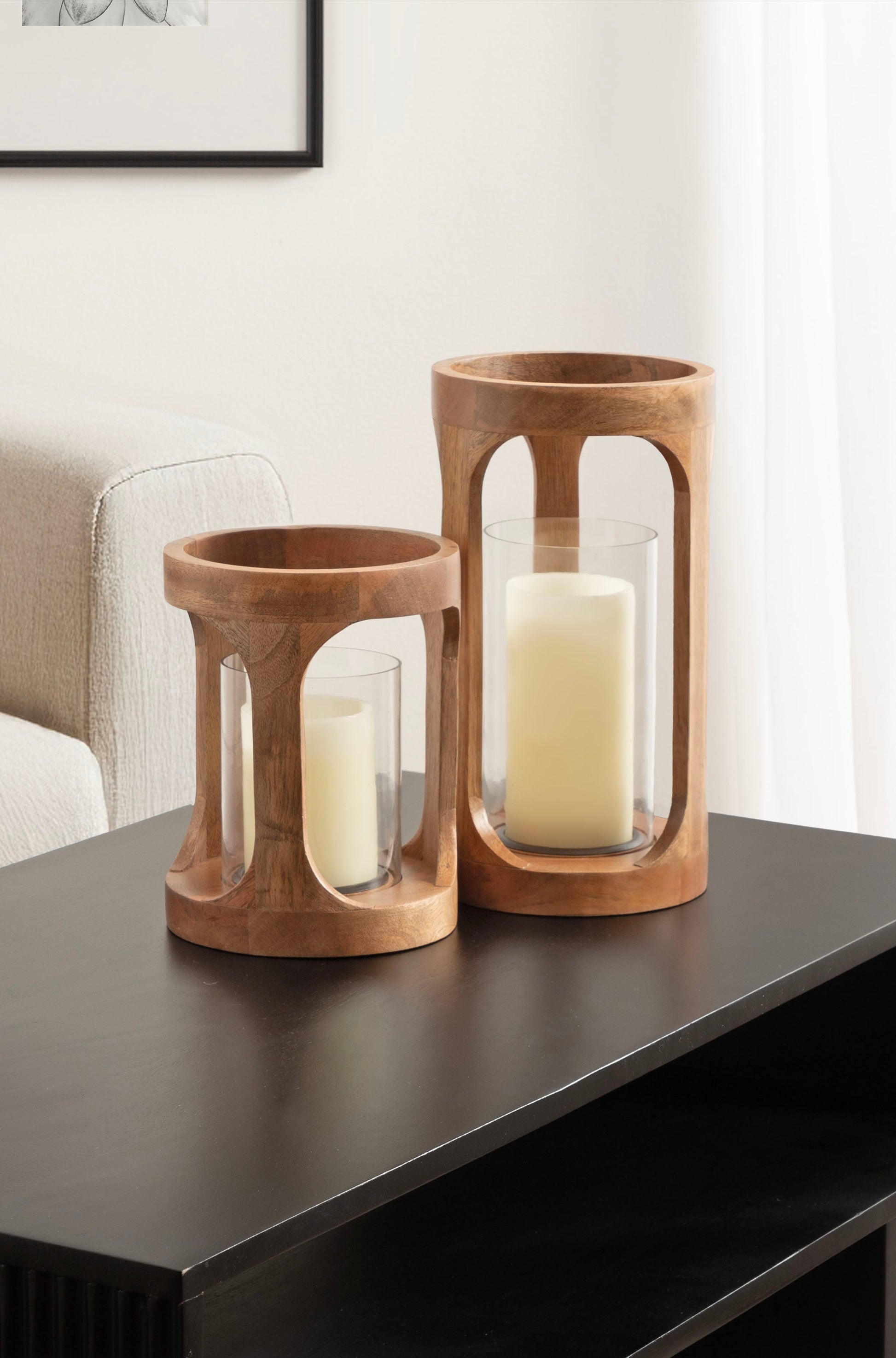 Upscale your hearth room with this modern Dahl two-piece candle holder set from Kate and Laurel. This set features two stunning candle holders designed to enhance any space with their geometric negative space design. With their natural wood finish, these candle holders add a touch of elegance and warmth to your fireplace mantel display, dining room, or coffee table. The sturdy wood bases provide durability, while the curved wood framing creates lovely additions of negative space. These candle holders have a lantern design with attractive handles to create a stylish way to showcase your favorite candles. The spacious glass cylinders allow the warm candlelight to glow beautifully, creating a cozy ambiance in any room. Whether you use them to display flameless candles for relaxation or simply as decorative pieces, these holders bring an effortless touch of tranquility to your living space.
