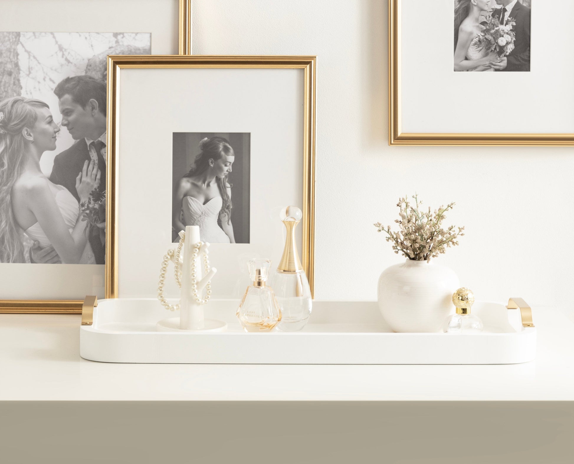 Bring transitional style into your home with this charming narrow wooden tray with metal handles. Place this narrow tray on your entrance console table as an accent tray to hold your keys and change as you come and go. This rectangle tray can also be used as a decorative accent on an ottoman to hold your beverages or on your vanity for makeup organization. Constructed of resilient wooden material and sturdy metal handles, this tray is dependable to carry your cocktails from room to room! An update to the classic accent tray, the base has a raised edge to keep your items more secure when transporting them. From a dining room table to a living room ottoman, this narrow tray brings tremendous versatility anywhere throughout your home. Its skinny size makes it great for serving snacks on little plates or as a decorative display option. The useful tray also includes protective padding on the bottom to prevent scuffs or damage to your hard surfaces.