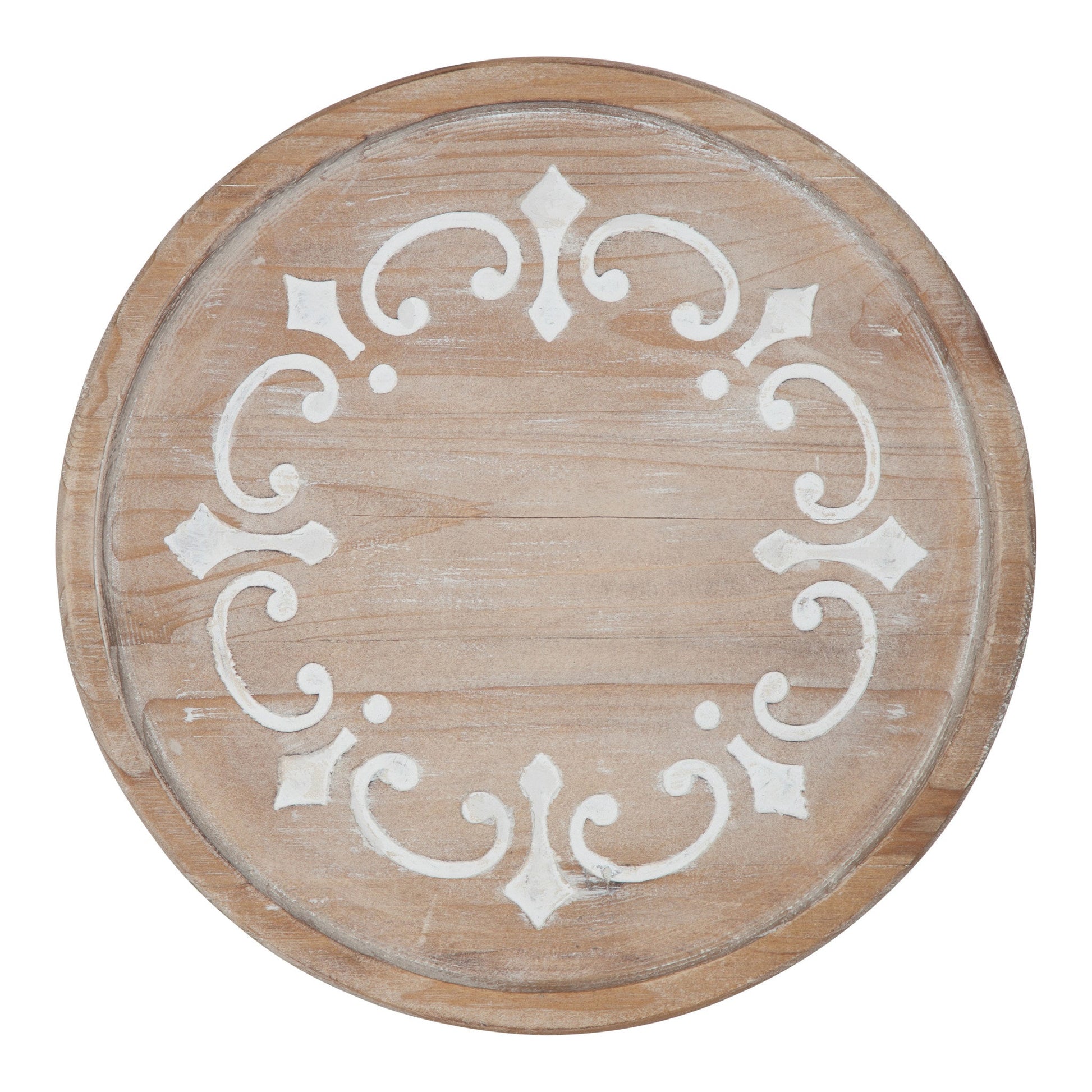 Embrace a shabby-chic, rustic decor aestheitic with the beautiful Sherald Pedestal Tray. It features an ornate, solid wood tray with a rustic whitewash finish and a beautiful, ornately carved pattern on its surface. Use it as a decadent candle holder, plant stand, or dazzling centerpiece for a dining room or for your next special get-together.